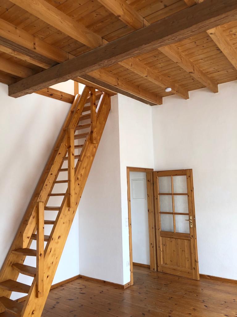 Holzdecken und Holzdielenböden verleihen dieser 2-Zimmer-Maisonetten-Wohnung eine besondere, entspannte, heimelige und behagliche Wohn-Atmosphäre.
