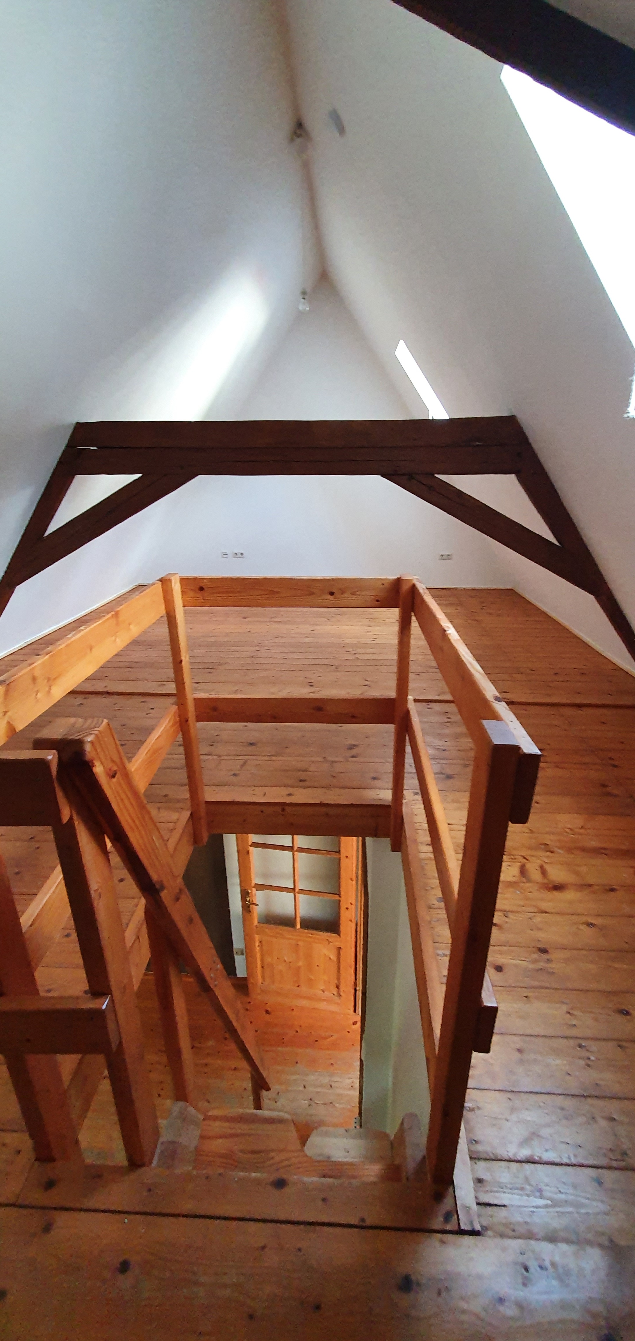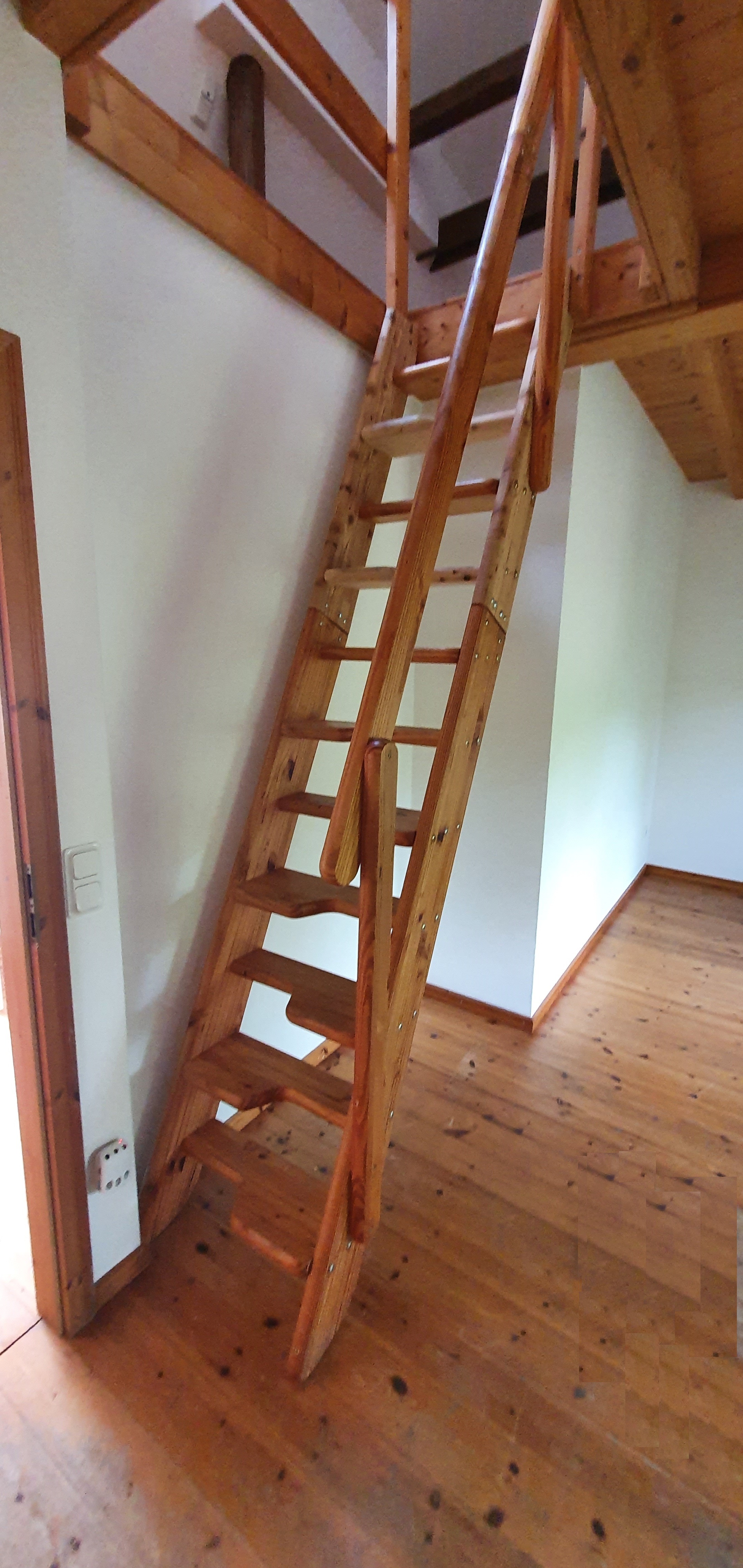 Eine freitragende Holz-Innentreppe verbindet das Ober- mit dem Dachgeschoss.
